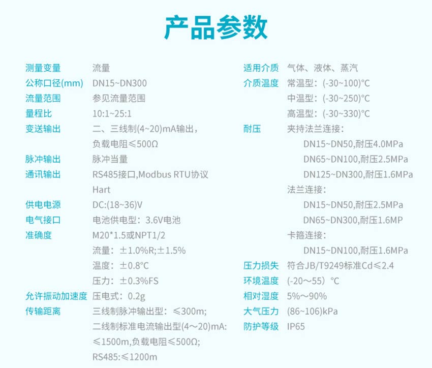 適用場合:渦街流量計是速度式流量計的一種,基于卡門(Karman)旋渦原理研究設(shè)計的,主要用于工業(yè)管道中介質(zhì)流體的流量測量,如:氣體、蒸汽或液體等多種介質(zhì)的流量控制和計量。渦街流量計廣泛應(yīng)用于供熱、供氣、化工、環(huán)保、冶金、紡織、鋼鐵、醫(yī)藥、造紙、排水等廠礦企業(yè)對過熱蒸汽、飽和蒸汽、壓縮空氣和一般氣體(氧氣、氮氣、氫氣、天然氣、煤氣等)、水和液體(如:水、汽油、酒精、苯類等)的計量和控制。